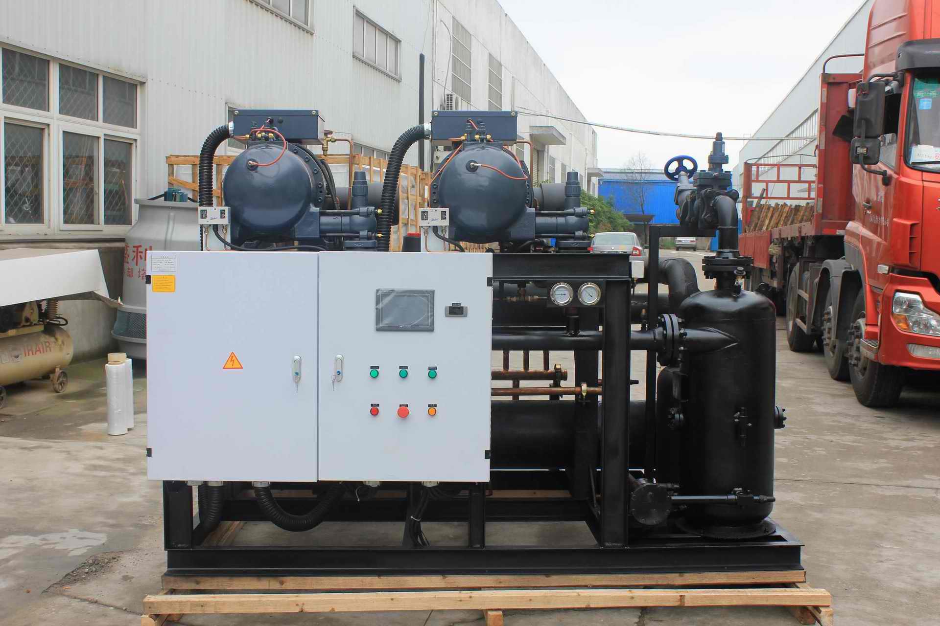 本次為黃山市大自然食品工貿(mào)有限公司設(shè)計建造的為座-30℃低溫速凍冷庫,冷庫保溫系統(tǒng)采用150MM高密度雙面彩鋼聚氨酯保溫板,制冷機(jī)組采用臺灣漢鐘半封閉螺桿制冷機(jī)組。